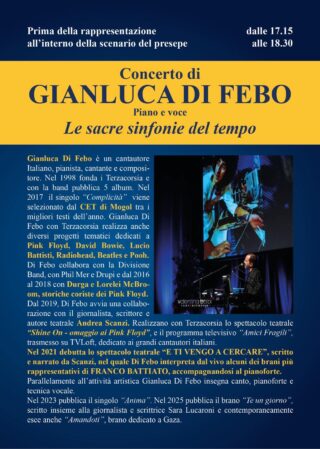 Ad aprire la serata, alle ore 17.30, sarà il concerto piano e voce di Gianluca Di Febo , intitolato ”le sacre sinfonie del tempo”, che accompagnerà il pubblico con brani (di Franco Battiato ed altri) dal forte richiamo al sacro fino all’inizio della rappresentazione. L’evento è organizzato dall’Associazione Pro Loco di Cerqueto.